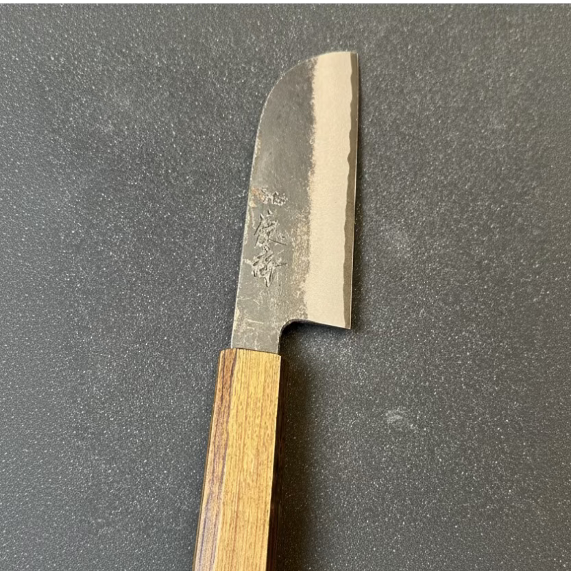 The kurouchi finish is intentionally raw, with visible forge marks and imperfections that reflect Tanaka-san’s deliberate, low-output approach. Paired with an octagonal smoked oak (Enkoku) handle, this Kawamuki, a traditional Japanese peeling knife is designed for precise in-hand work, ideal for fruits, vegetables, and fine detail prep